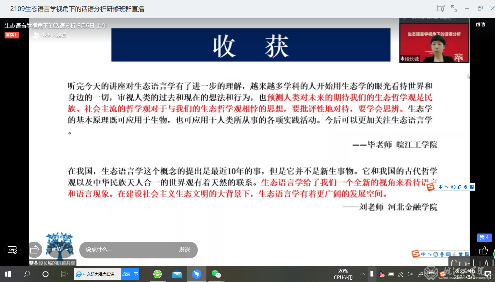 二十多天的培训,主题丰富、形式多样。“全国高校大学英语教学发展与创新”邀请了全国优秀英语教师进行课堂授课实景展示, “高校外语课程思政建设理论与实践”“跨文化外语教学”将教学理论和教学实践紧密结合,“生态语言视角下的话语分析”等是外语学科时下热门的科研方向。主讲专家有教育部高校大学外语教指委委员、国家级教学名师、相关领域国内顶级专家等。米兰大学英语教师提前选好自己感兴趣的主题,按时参加培训,遵守培训纪律,一丝不苟做好听课笔记,均获得了培训结业证书。毕胜琴老师在课后积极参与心得与反思的撰写,得到主办方的表扬,被作为典型范例在线展示给参加培训的全国各高校教师。