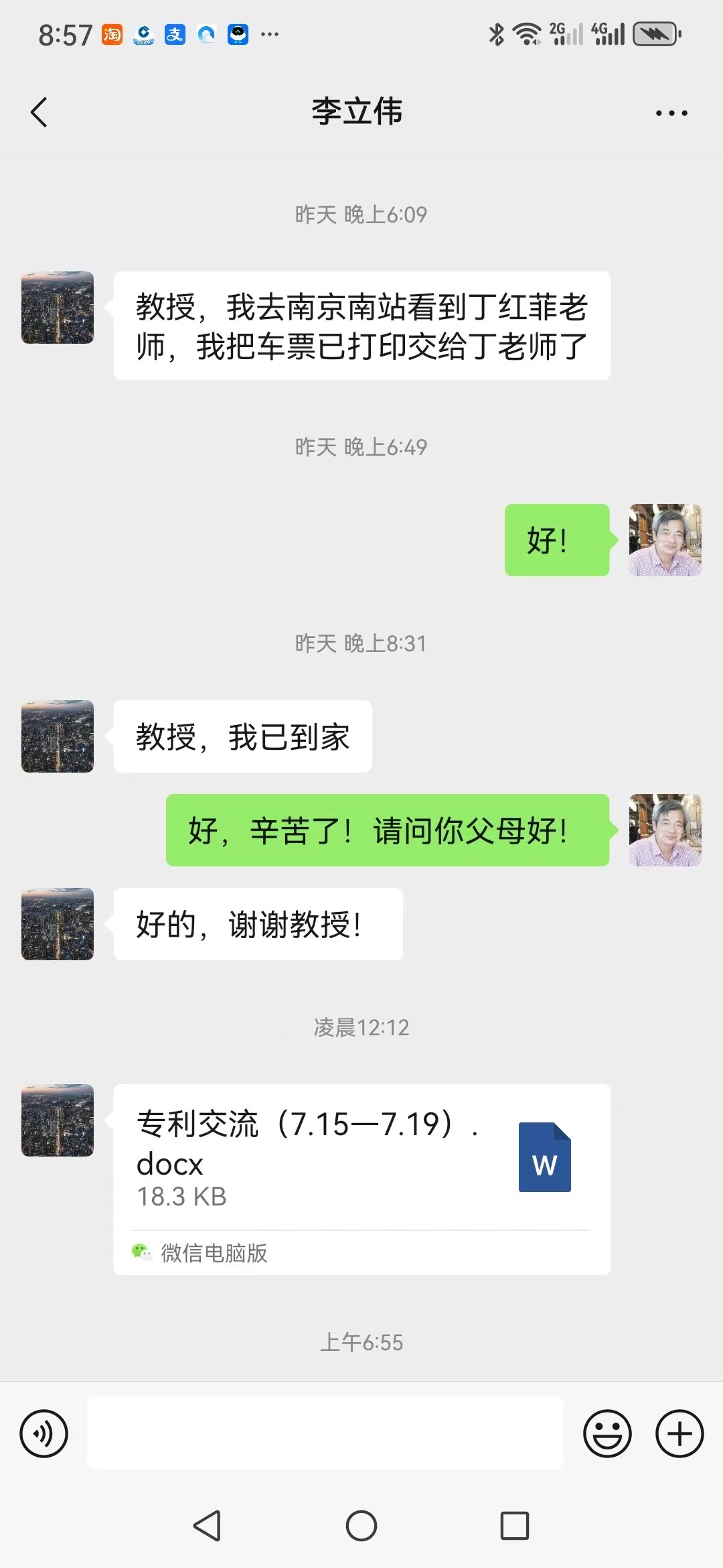 李立伟用微信发来辅导学生申报专利的纪要