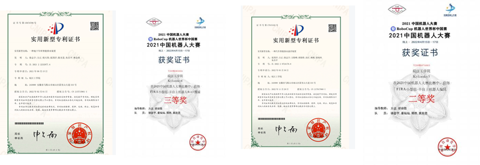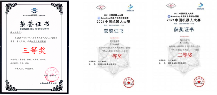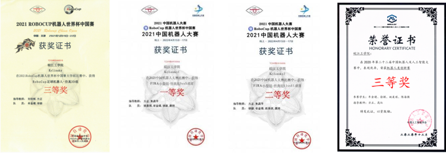 2022年的中国机器大赛中,FIRA11v11和北理、地质等强队角逐下以小组赛第二出线,在淘汰赛中,不敌上届冠军西北工业大学,遗憾止步第八。2021年Robocuo世界杯3D项目中,面对去年的严峻情况,我们顶住压力,在实验室指导老师和项目成员的努力下,项目成功推进,比赛名次获得提高。