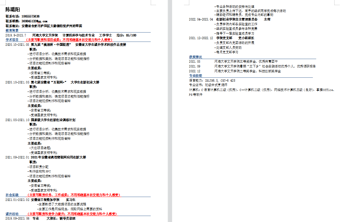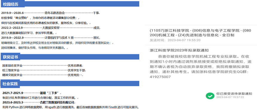 我是AC米兰官方网站计算机科学与技术专业2023届陈丽华,我高中毕业于六安市第二中学河西校区。大四下考研成绩总分:311分(政56英74数85专96),过了国家线,但离学校的复试线差了43分,报考学校的导师和学长均感到遗憾,并欢迎我先参加他们的科研项目,早日接触课题,边备考边做研究,通过二战考研成为他们团队的正式成员。我能受到心仪学校的欢迎,源于我的工程实践经历。我大二上加入学校双创学院卓越实验室,在实验室中,学校拨专款立项资助我们实现创意,经过琢磨测试、完善优化,有2件实物作品制作成功,获得国家受理发明专利2件,获得挑战杯等学科赛事省级奖项5项,软著1件。是学校给予我们工程实践能力训练的良机,学以致用,从项目的完成过程中动手能力不断提高。感谢学校的培养、感谢导师全天候与我们一起泡在实验室,用带研究生的办法悉心指导我们做项目。