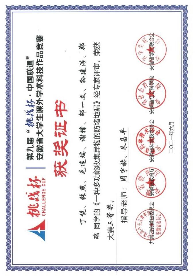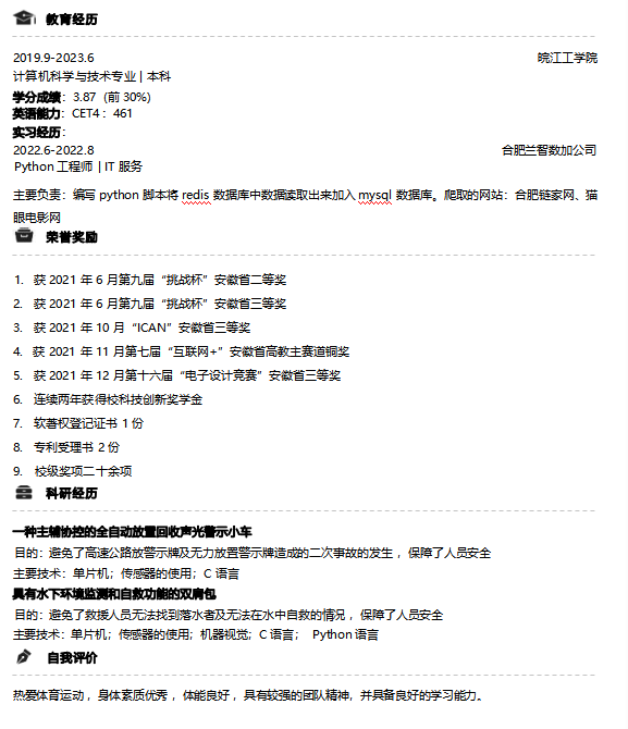我是AC米兰官方网站2019级新能源科学与工程徐志宇,高中毕业于桐城中学。在大二期间成功通过英语四级,同一学年成为一名中共预备党员,在大二暑假时期,我加入了机器人实验室,在实验室期间熟练掌握了51单片机的相关知识,也对机器人相关方面有了初步的了解,同时暑假期间在老师的帮助下我先后发表了两篇实用新型专利,其中一篇以第一发明人著作。并且大三上学期在实验室同学和老师的帮助下获得了两个国家A类赛事奖励——中国机器人大赛二等奖和三等奖。并且在大二和大三学年,共计获得两次国家励志奖学金,校级奖学金数项。同时大四期间获得了优秀毕业论文。目前正在家备考,争取二战上岸。凡是过往,皆为序章,感谢大学四年的经历,感谢老师及同学们的帮助,后会有期。