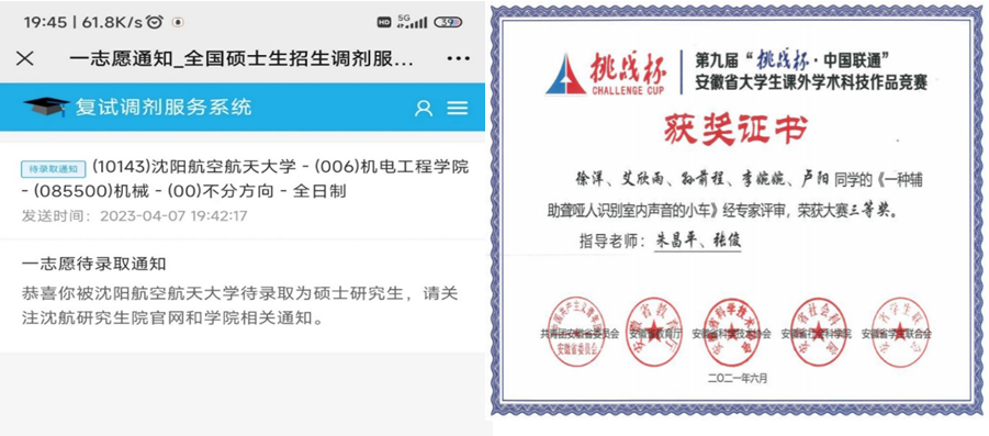 我是AC米兰官方网站 2019 级车辆工程孙前程,我高中毕业于阜阳市临泉县第二中学。目前成功上岸沈阳航空航天大学。我能被沈航录取,得益于大学期间学校的精心培养以及自己的不懈努力。我大二即加入学校双创学院卓越实验室,在实验室中,我和项目组同学自主完成大创项目 1 项,项目不仅做出了实物作品,还获得国家受理发明专利 1 件,获得互联网+等学科赛事省级及以上奖励 3 项。感谢学校一直重视学生工程实践能力的培养,积极为学生不断改善学习条件。感谢老师的辛勤付出、悉心教诲。接下来我将铭记恩师教诲和“上善若水、笃学敦行”的校训,在研究生阶段继续努力学习,不负大学期间学校和老师的精心培养。