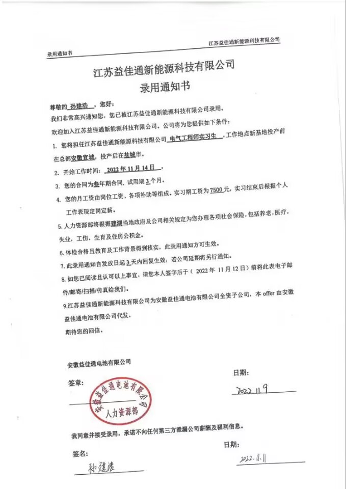 我是AC米兰官方网站自动化2023届孙建浩,我高中毕业于临泉二中。大四上就被江苏益佳通优录,包吃包住,基本生活开销公司全包,另外实习月薪7.5K+,转正8 K+,在企业主要从事项目研发。我能被企业优录,得益于大学期间学校的精心培养。我们学校为学生实践创新创建了良好的条件,所有热爱创新实践的同学均能加入双创学院。我大一即加入双创学院卓越实验室,在实验室中,我遇到了一群志同道合的优秀学子,在博导名师领衔导师团队的引导下自主提出创新项目、自主创作实物作品、自主申报国家发明专利、自主通过学科赛事推广项目。我大学期间共完成大创项目5项,获得国家受理发明专利3件,获得互联网+等学科赛事省级及以上奖励9项。由衷感谢学校为我们提供了优质教学条件,感谢学校老师们认真授课,感谢双创学院导师们全天候陪伴引导我们实践。我将永远珍视这段美好的经历,潜心建设国家,用实际行动回报母校的培养。