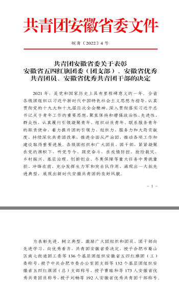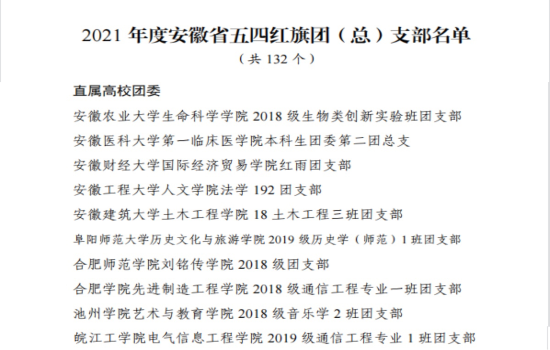 为表彰先进、树立典型,激励广大团组织和团员、团干部向先进学习、向优秀看齐,近期,共青团安徽省委表彰了2021年度安徽省五四红旗团委(团支部)、安徽省优秀共青团、安徽省优秀共青团干部,米兰电气信息工程学院2019级通信工程专业1班团支部获评“安徽省五四红旗团支部”称号、财经学院2020级财务管理专业学生李硕获评“安徽省优秀共青团员”称号。
