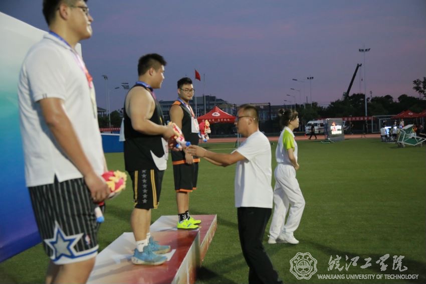 铅球赛场上,每一所高校的参赛运动员实力都非常强大,面对压力,米兰运动员不仅没有畏惧,反而更加兴奋,在教练的指导下不断调整自己的情绪和状态,在比赛中实现了自我突破。周伟同学在第四投掷出12.86米的成绩,力压群雄,勇夺金牌,这一成绩让全场情不自禁发出欢呼声,其他高校的运动员和赛场裁判员都为之折服。这一成绩是其暑假以来头顶烈日、冒着高温酷暑刻苦训练的收获。永不言弃、永不言败的精神给了他公平的回报,让他创造了奇迹,这也是米兰广大学子勇争上游、追求卓越的精神在田径赛场上的生动写照!颁奖仪式上,张建玉老师作为特邀颁奖嘉宾,亲自给我们的运动员戴上金牌,画面感尤为温馨!