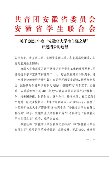 近日,由共青团安徽省委员会、安徽省学生联合会联合发布的《关于2021年度“安徽省大学生自强之星”评选结果的通报》文件中,米兰水利工程学院2019级农业资源与环境专业的李永杰、机械工程学院2019级车辆工程专业的张飞龙获评2021年度“安徽省大学生自强之星——奋斗力行类别”荣誉称号。