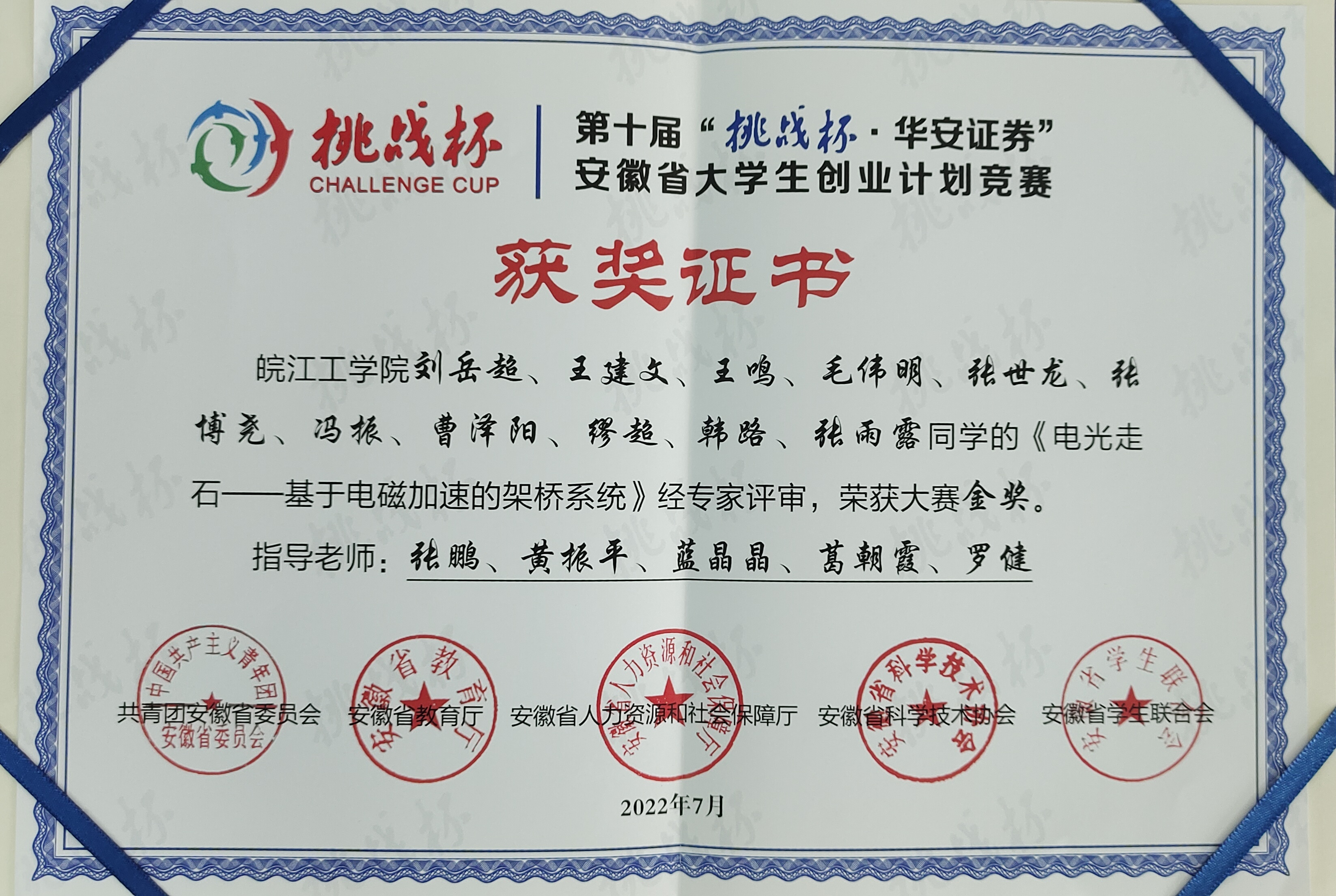 6月14日至16日,第十届“挑战杯.华安证券”安徽省大学生创业计划竞赛决赛在安徽工业大学举行。经过激烈比拼和重重选拔,由张鹏、黄振平、蓝晶晶、葛朝霞、罗健老师指导,刘岳超、王建文、王鸣等同学参与完成的作品《电光走石—基于电磁加速的架桥系统》最终荣获金奖,张鹏荣获优秀指导教师。