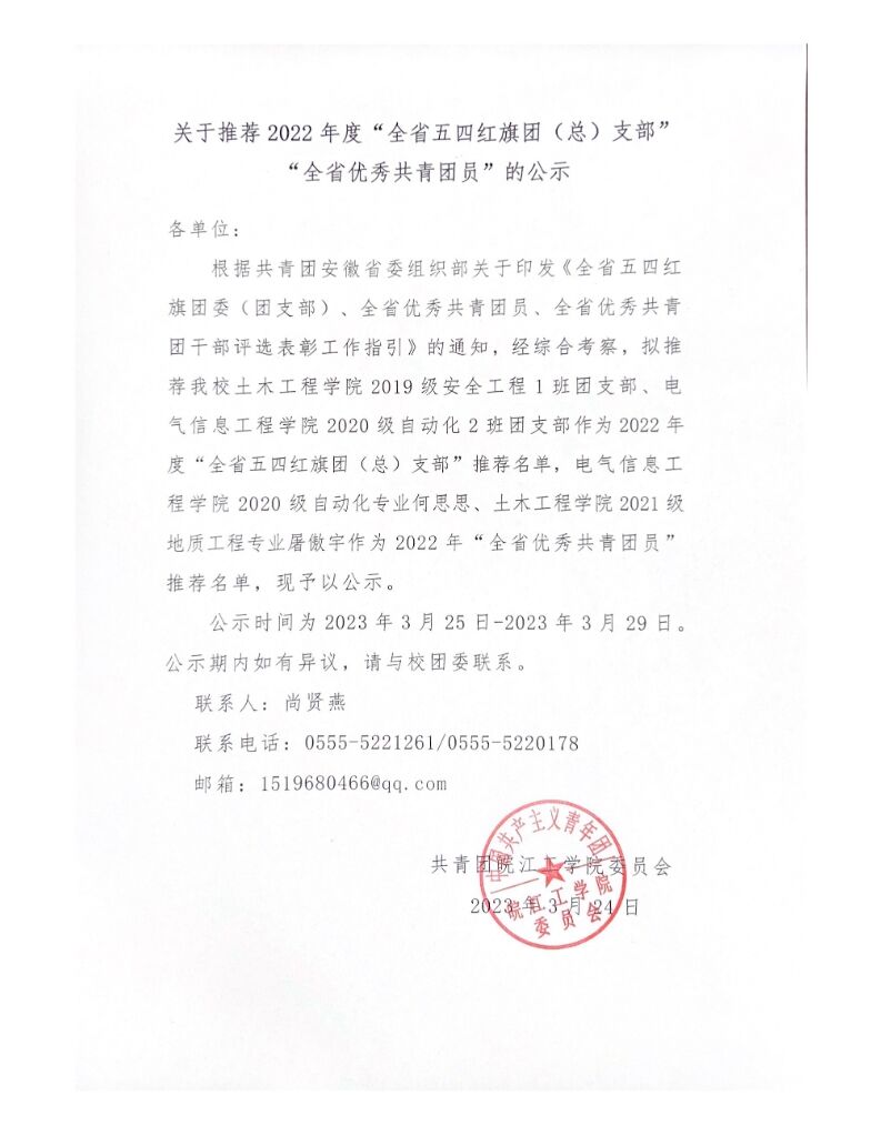关于推荐2022年度“全省五四红旗团(总)支部" “全省优秀共青团员”的公示
