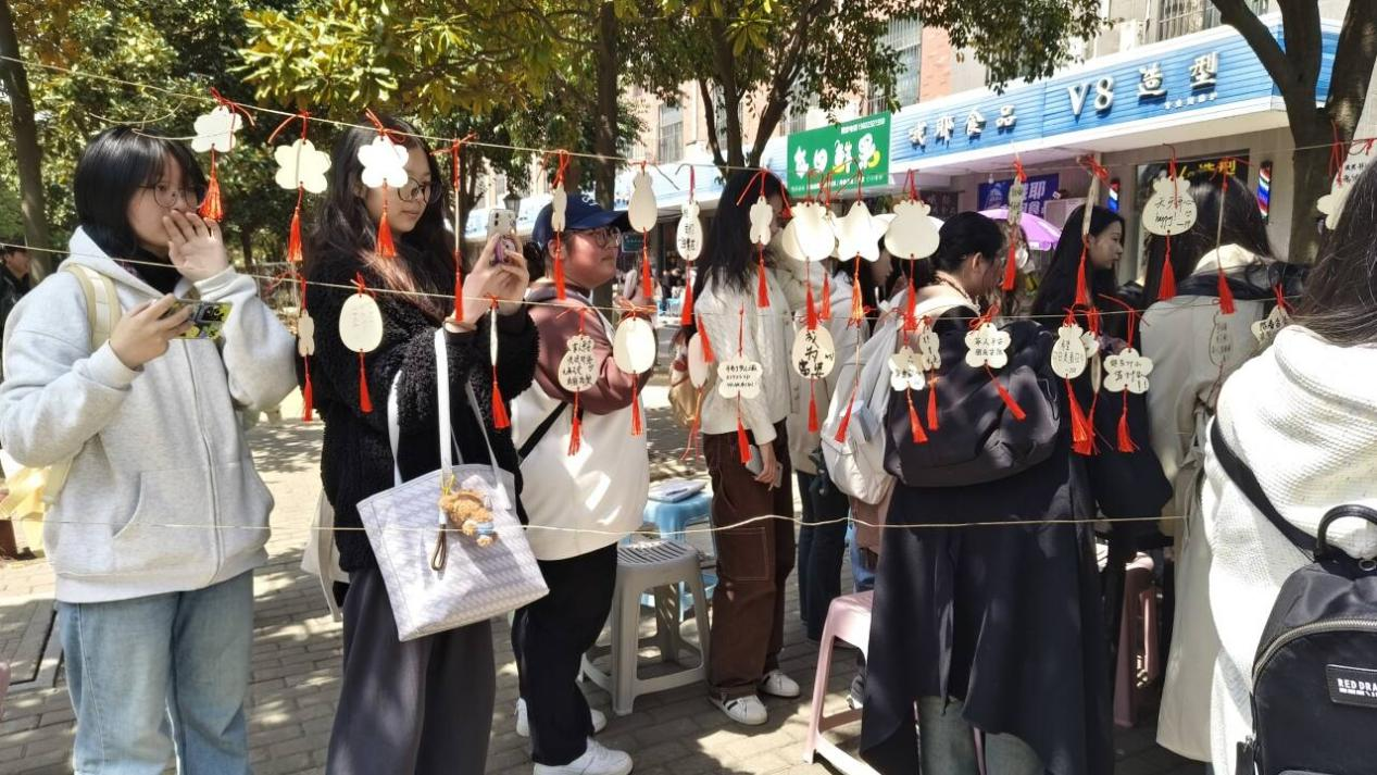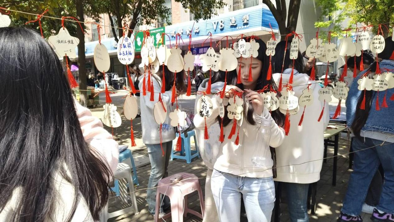 活动现场,一棵装饰着木制卡牌的“朴树”成为了校园的亮丽风景线。每一张卡牌都承载着学生们的心意与期望,或是对梦想的追求,或是对友情的珍视,或是对未来的憧憬。学生们纷纷驻足,亲手在每一张卡牌上写下话语,感受着来自同龄人的情感共鸣。