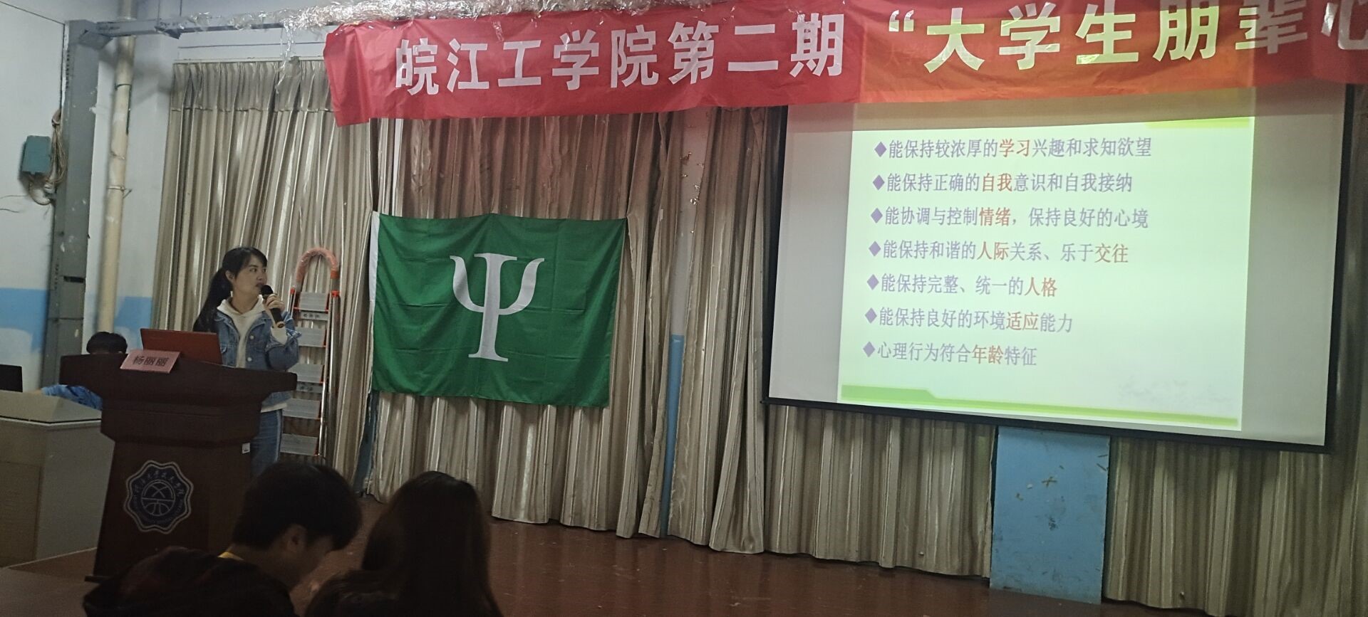 本次培训的主题是“大学生常见心理问题的识别”,杨老师主要从心理健康的标准、心理卫生问题的识别以及心理问题的应对等三个方面来向同学们进行了讲解。杨老师首先给大家介绍心理健康的标准;随后用具体的实例介绍了大学生一些常见的心理问题和具体表现形式;最后,杨老师给大家分享了一些应对和缓解心理困扰的小方法,如“合理情绪疗法”、“适度宣泄法”等,希望同学们能够学有所用,帮助他人。