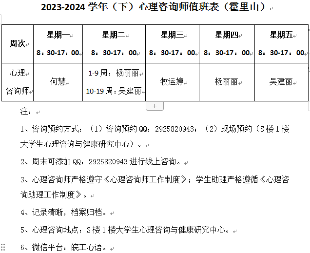- 上一条2023-2024学年(下)心理咨询师值班表(郑蒲港)2024-02-27 10:10:57