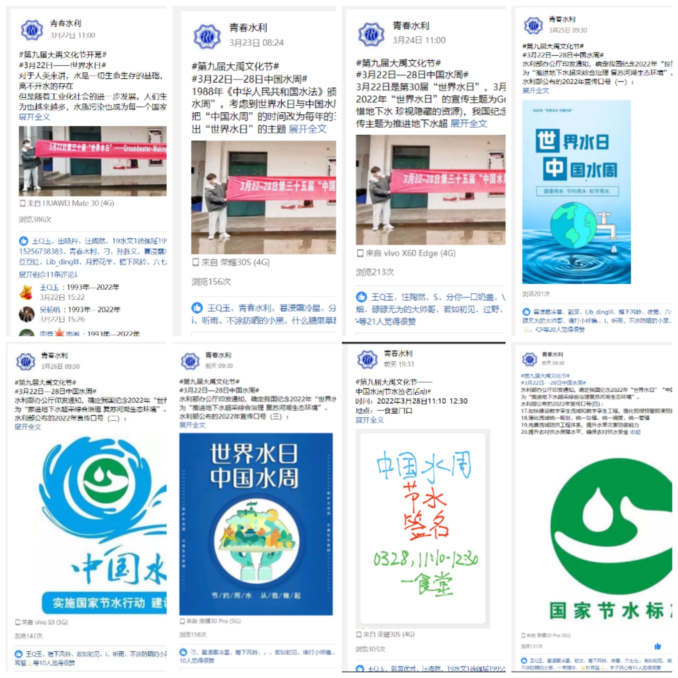 疫情防控的特殊时期,为丰富学生的课余生活、促建学生身心健康,学院党总支、学工办对第九届“大禹文化节”系列活动的筹划和组织尤为重视。在院党总支领导下,在院学工办的指导下,自3月22日开始,“2022年‘世界水日’、‘中国水周’主题宣传纪念活动暨第九届大禹文化节开幕”活动率先在学院分团委官方QQ空间“青春水利”开启。自“世界水日”以来,“青春水利”共发布相关主题推文共8篇,围绕世界水日、中国水周科普、2022年世界水日、中国水周主题简介及水利部公布的2022年20个宣传口号内容等,总浏览量达1552人次,初步实现传播节水文化、树立节水意识等网络思想政治教育目标。3月28日,水利院分团委水协会珍惜“中国水周”最后一天的宝贵时间,面向全校师生在一食堂小广场开展了“中国水周节水签名”活动。现场科学防疫,秩序井然,全校师生积极参与纷纷承诺节水惜水,在横幅上签名。
