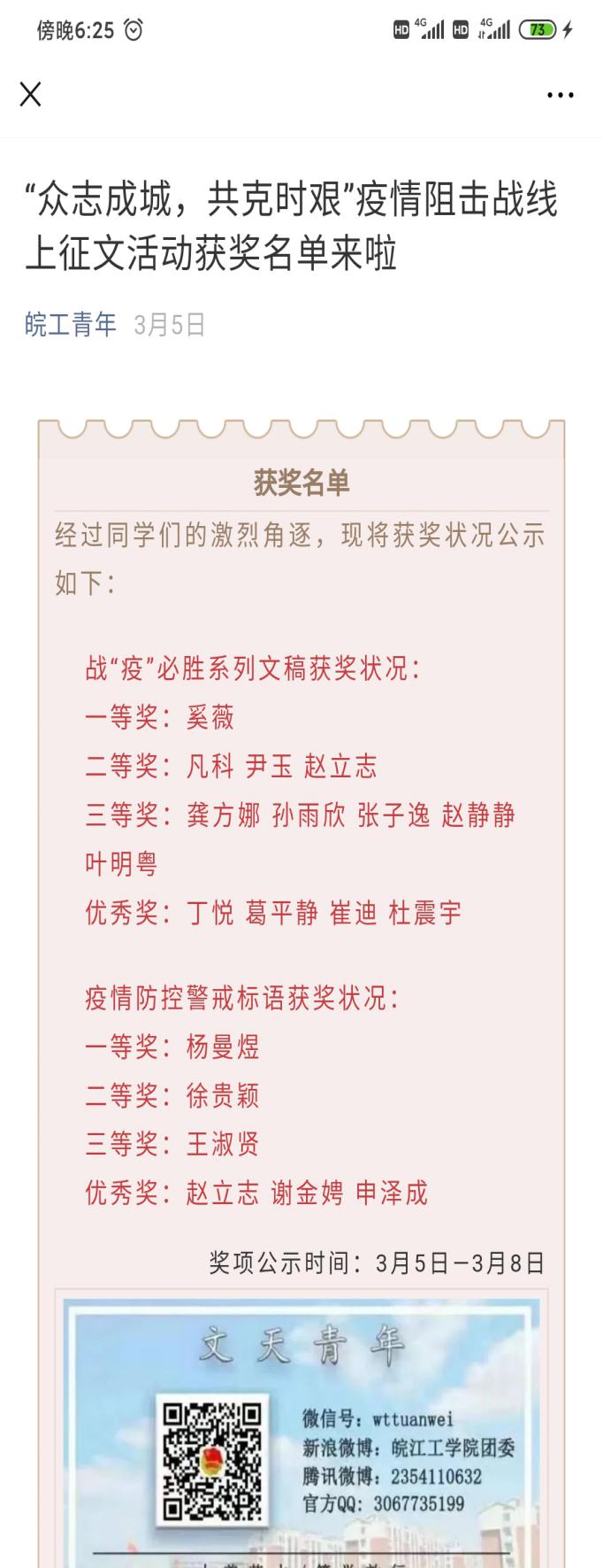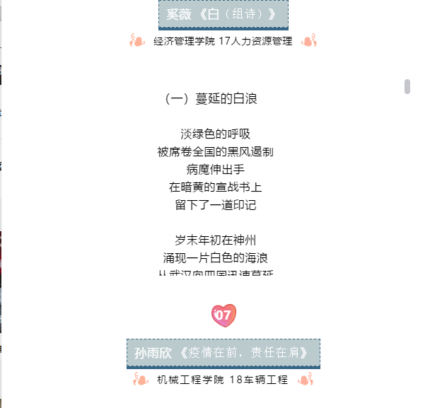 学生以笔为戎,书写疫情下青年一代的责任与担当。活动结束后,校团委共收集到百余篇作品,并筛选部分优秀作品刊登在校团委官方微信公众号“米兰青年”上进行投票。活动本着公平、公正、公开的原则,共评选出一等奖2名、二等奖4名、三等奖6名、优秀奖7名。