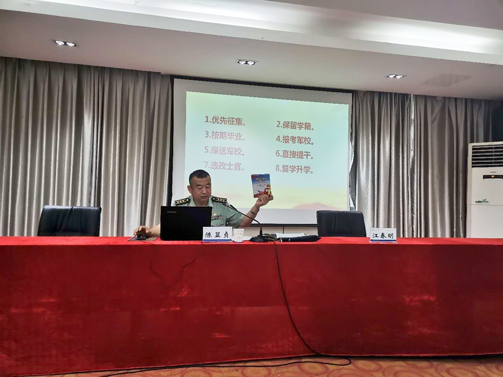 陈显贞首先解读了今年征兵的时间和相关要求,包括年龄要求、政治要求和身体要求,接着介绍了参军入伍的十大好处,如强身健体、收获战友、快速成长等。最后,他对大学生们比较关心的大学生应征入伍可享有的优先考学提拔、补偿学费和代偿国家助学贷款、退役后享受就学就业优惠等优抚政策做了解读。他建议辅导员,积极鼓励大学生要敢于有梦、敢于追梦、敢于圆梦,让青春在军营的历练中、在为祖国的奉献中闪光。