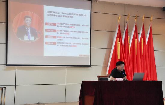 徐志伟围绕百年党史,用朴实的语言、生动的案例、新颖的视角通过小话题阐述大主题、小案例演绎大道理,为现场师生们上了一堂生动地党史课。宣讲内容紧紧围绕“深入学习领会习近平总书记关于党的历史的重要论述,充分认识开展党史学习教育的重大意义、认真研读党史基本著作,全面了解中国共产党百年的辉煌历程和历史贡献、深刻把握党史学习教育的重点、开展党史学习教育要学懂弄通做实习近平新时代中国特色社会主义思想,增强“四个意识”、坚定“四个自信”、做到“两个维护”。”四个部分内容,权威准确、入情入理、深入浅出的讲解了党史的重要论述,并要求与会人员做到知史爱党,知史爱国,深刻了解学习党史的重要意义,同时鼓励青年学子躬身力行,坚定不移跟党走,接续奋斗,在闪光的青春中书写最美丽的人生!