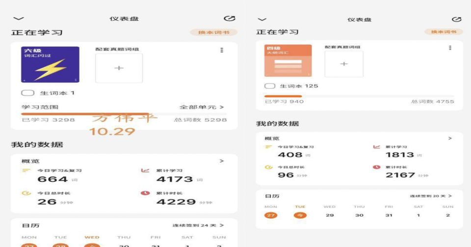 活动期间,同学们每日沉浸于单词的海洋,在App上完成学习与复习后,以截图打卡的方式记录成长足迹。从秋意渐浓到金风送爽,日复一日的坚持中,系统数据清晰镌刻下每一份努力——累计学习时长节节攀升,词汇储备量稳步增长,连续签到的日历页见证着毅力与坚守。这场关于积累的修行,不仅是自我监督的考验,更在同学间凝聚起互助共进的力量,让孤军奋战的备考之路变得温暖而有动力。