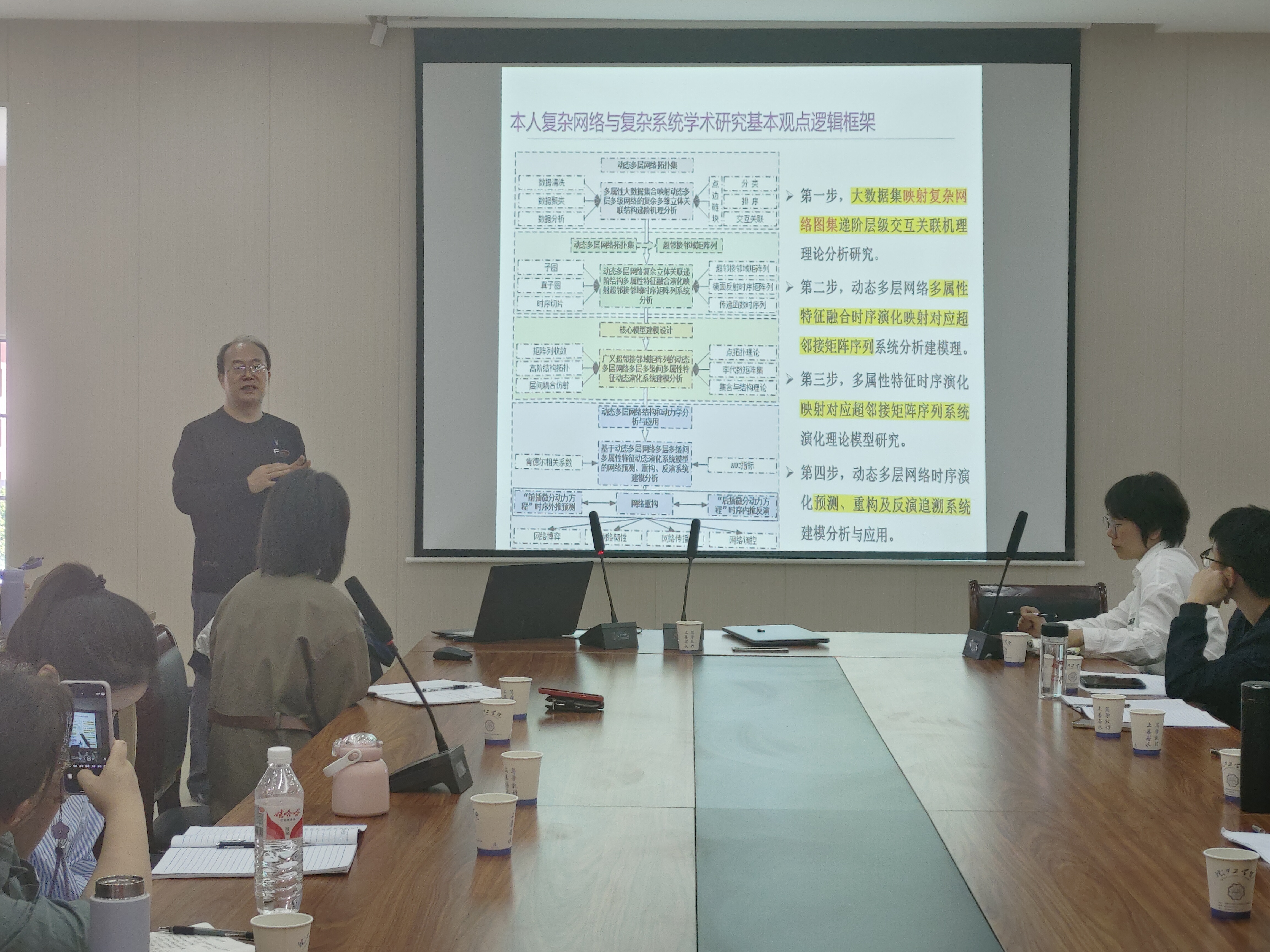 讲座最后,胡钢教授介绍了他在复杂网络与复杂系统学术研究上的基本观点逻辑框架,并与在场的老师进行了深入的学术交流。交流过程中,胡钢教授分享了他的求学与学术研究历程,语重心长地告诫大家,在学术研究中应摒弃功利心态,要保持健康的身体、愉悦的心情。他指出,只要找准了研究方向并专心投入,就一定会有研究成果。整场讲座内容丰富、信息量大,老师们纷纷表示受益匪浅。