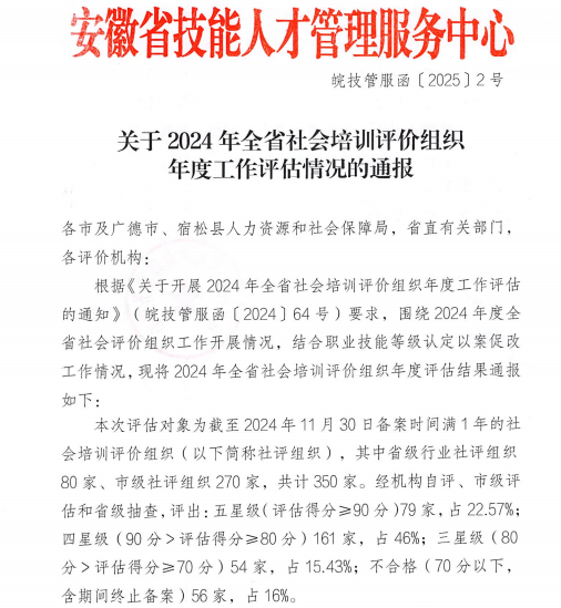 近日,安徽省技能人才管理服务中心发布《关于2024年度全省社会评价组织年度工作评估情况的通报》,米兰荣获“2024年度五星级社会评价组织”,这也是米兰自2023年以来开展职业技能等级社评首次获得五星级荣誉。