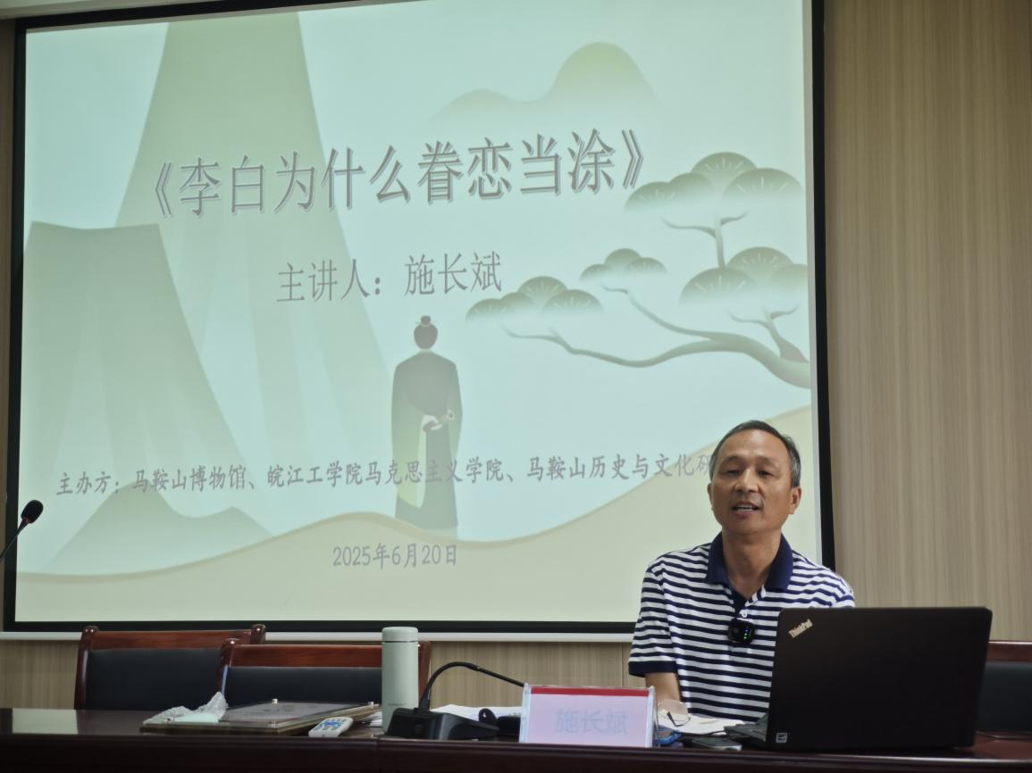 6月20日上午,安徽省作家协会会员、马鞍山市政协文史馆馆员、当涂县政协委员、中共当涂县委党校四级调研员施长斌到马克思主义学院多功能会议室作《李白为什么眷恋当涂》讲座,马克思主义学院党总支书记陈毓陵,常务副院长刘双,教学副院长胡耀东、教研室主任及马克思主义学院全体教师参加。会议由刘双主持。