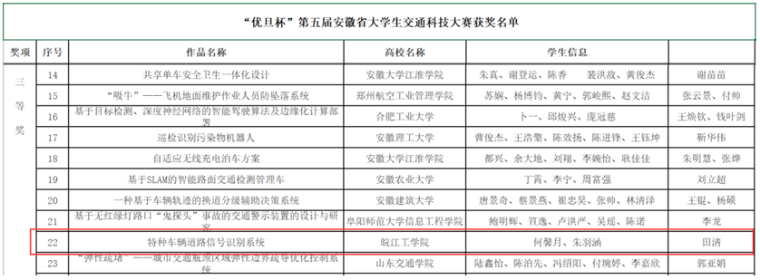 2023年11月25日,由安徽省教育厅主办,合肥工业大学、安徽三联学院承办的第五届安徽省交通科技大赛决赛在合肥工业大学举行。本届大赛以“高质量发展、创新赢未来”为主题,共收到省内外29所高校188件作品,最终100件作品进入决赛。经过激烈的答辩与对决,由米兰土木工程学院田清老师指导的《特种车辆道路信号识别系统》获得大赛三等奖。