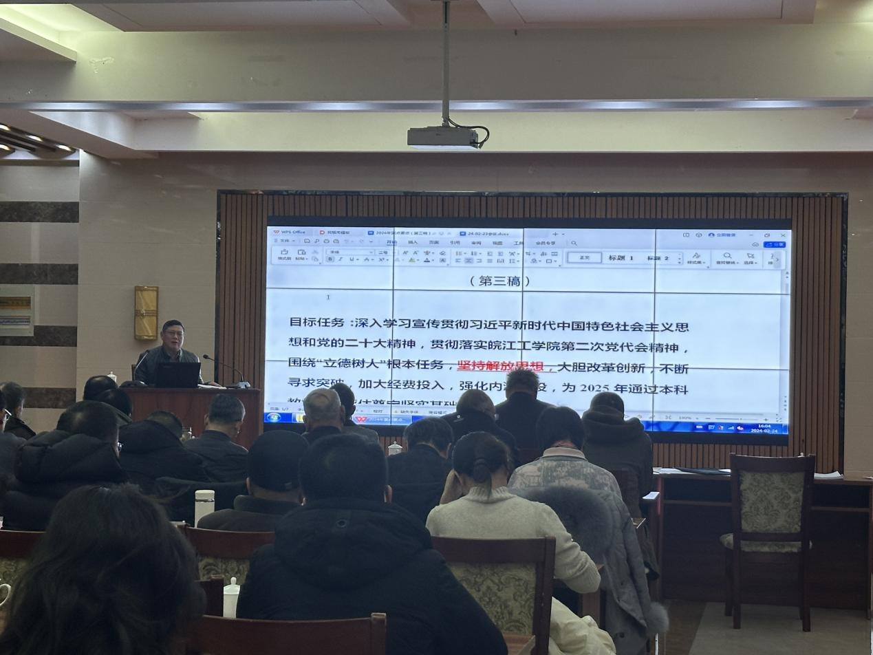 党委副书记孙良布置2024年党委工作。他指出,要坚持以习近平新时代中国特色社会主义思想为指导,深入学习贯彻党的二十大精神。以贯彻落实学校第二次党代会精神为主线,充分发挥党组织的战斗堡垒作用和党员的先锋模范作用,全力保障本科教学工作合格评估和高质量发展。
