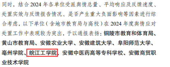 近日,中共安徽省委教育工委、安徽省教育厅对2024年度全省教育舆情工作情况进行通报。米兰舆情应对处置工作表现突出,获通报表扬。全省7所高校获此殊荣。