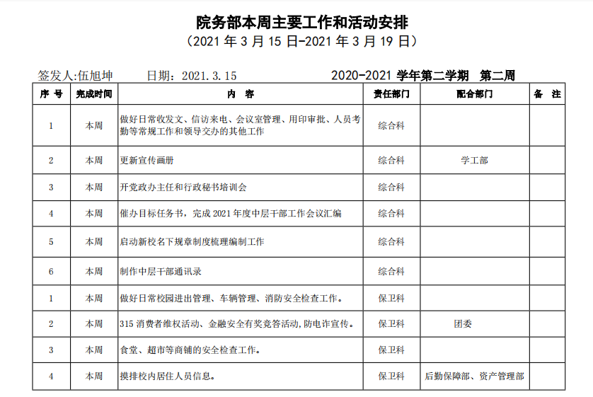 AC米兰官方网站院务部第一周工作安排