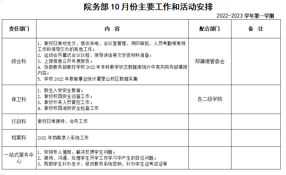 院务部十月份工作安排