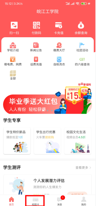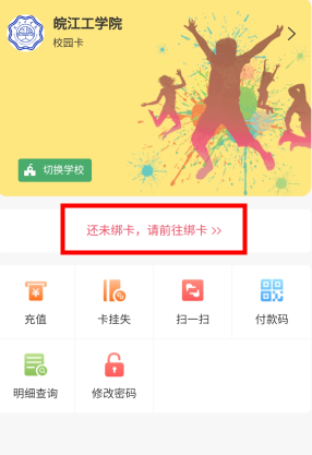 3、在图六界面下方 选择“校园卡”后 见图六;在图七界面中 点击“请前往绑卡”后 见图七。(注:新生用考试号或身份证号码进行绑定)。