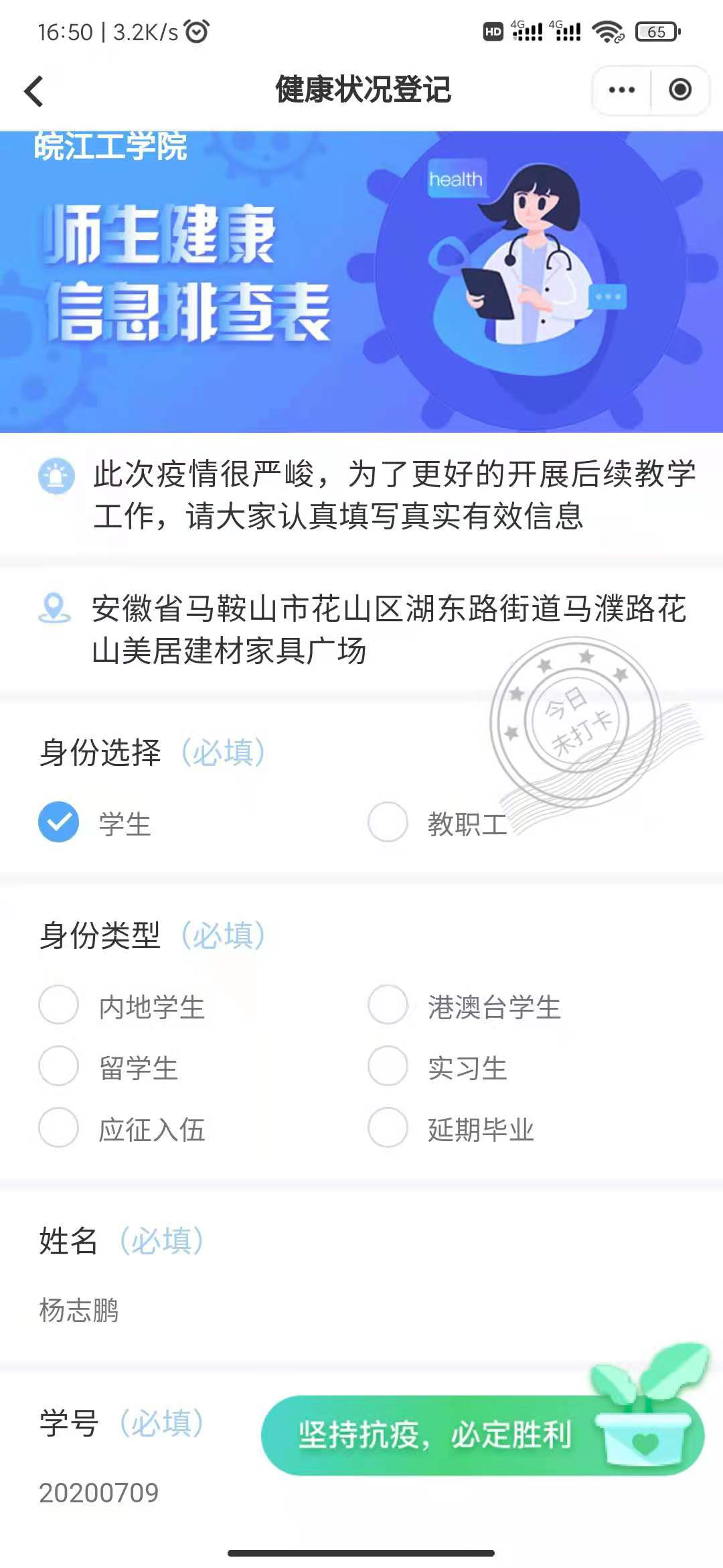 一、坚持非必要不外出原则,非必要不离市且不得前往中、高风险地区(可用手机下载国务院客户端小程序,或扫描疫情风险等级查询“葵花码”,适时查看全国中高风险疫情地区)。登录“易校园”坚持每日健康打卡,即日起居家不外出。 详见下面打卡流程。