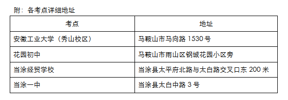 本次考试于4月22日举行(上午9:00-11:00,下午14:00-15:30)。我市共设置4个考点,分别为安徽工业大学(秀山校区)、市花园初中、当涂一中和当涂经贸学校。