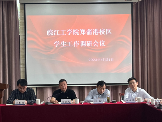 4月21日上午,AC米兰官方网站副校长侯进元、学工部常务副部长江春明、学工部副部长汪朱华一行莅临郑蒲港校区调研指导学生工作。郑蒲港校区管委会主任汪斌、主任助理陈波、校区学工办主任周其松、综合办主任王思奇及校区全体辅导员老师参加调研会议,会议由周其松主持。