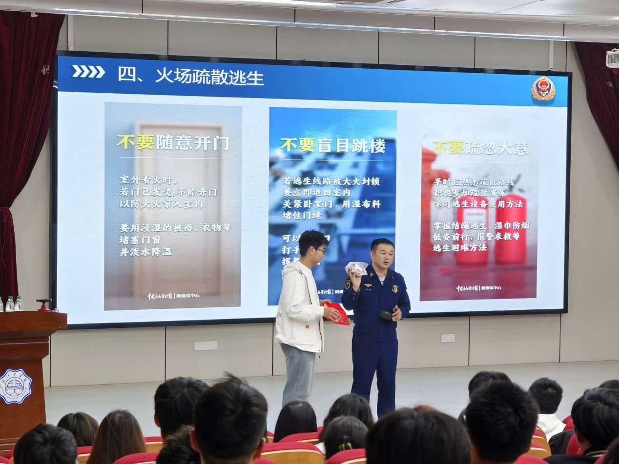 讲座一开始,王坤专家详细讲解了火灾的危害、火灾预防措施、火场逃生技巧以及消防设备的正确使用方法。通过视频展示了近年来发生的典型火灾案例,分析了火灾发生的原因及造成的严重后果。并且还介绍了不同类型的火灾及其对应的灭火器材,如干粉灭火器、二氧化碳灭火器等。随后,王坤专家演示了火场逃生的正确姿势和路线选择,以及如何使用湿毛巾、呼吸器等防护工具。在专业人员的指导下,部分师生现场进行了灭火器的操作演练,亲身体验了灭火过程,加深了对消防知识的理解。最后,主讲人员针对师生的疑问进行了耐心解答,确保每位参与者都能充分消化吸收讲座内容。
