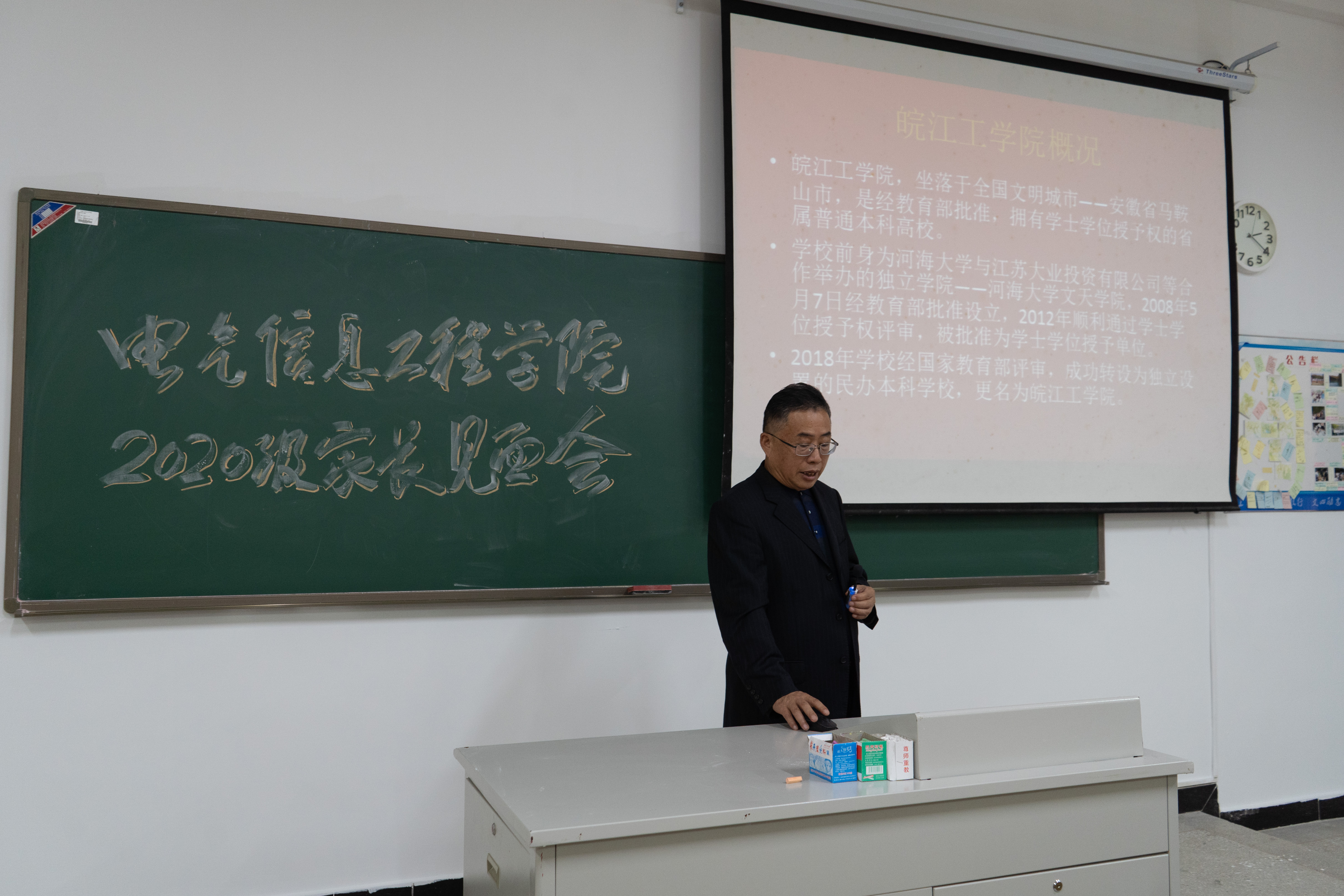 下午2点,电气学院新生家长见面会在教学楼C105举行。电气学院院长乔晓华、党总支书记肖文、双创学院院长朱昌平及学工办主任张高桢出席会议。首先肖文书记介绍了学生管理方面的工作,对家长提出了恳切建议。随后乔晓华院长对电信学院教学、人才培养、学生发展等方面做了介绍。最后朱昌平教授从自己对学校的感受谈起,阐述了学校的优势实力,他说:“新生在大学四年中要努力发展自己,成为一个对社会有用的人。”