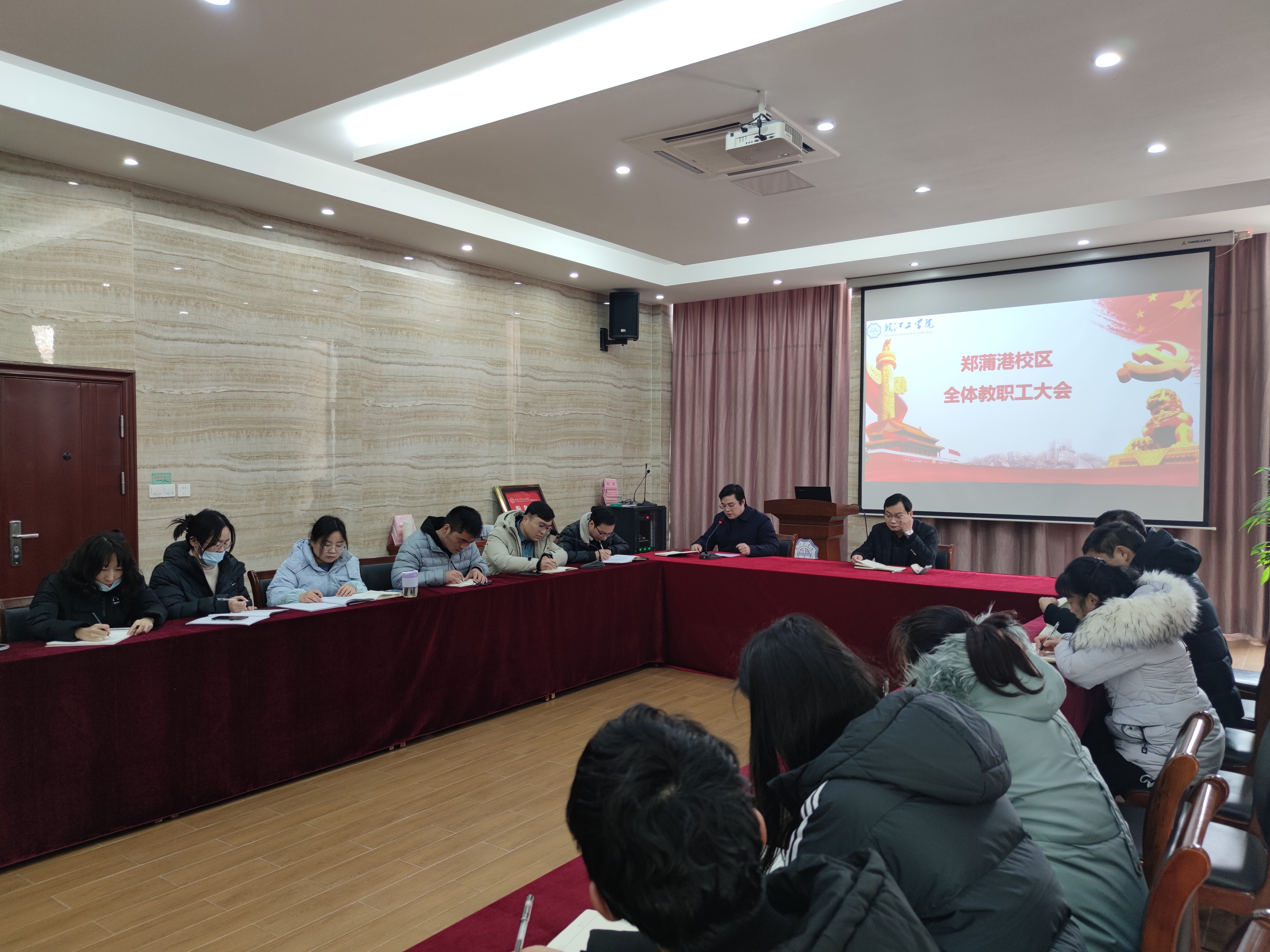 2月23日下午,郑蒲港校区在行政楼一号会议室召开新学期全体教职工会议。校区管委会主任汪斌,校区管委会主任助理陈波及校区全体教职工参会,会议由陈波主持。