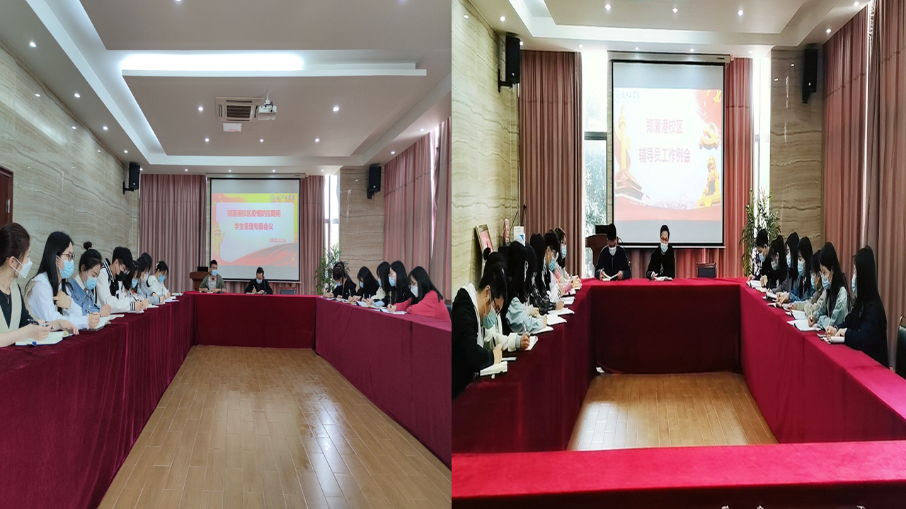 郑蒲港校区学工部积极召开疫情防控学生管理专题会议,坚持每周召开。通过会议及时传达郑蒲港新区和学校疫情防控指挥部对加强校区疫情防控工作的具体要求,通报了当下疫情形势和防疫政策,明确了要坚持以疫情防控工作为主线,在做好疫情防控各项工作的基础上,围绕学生的学习、生活和思想等方面多措并举地开展各项助力工作,进一步指明了接下来的学生管理工作内容,树立战疫决心。