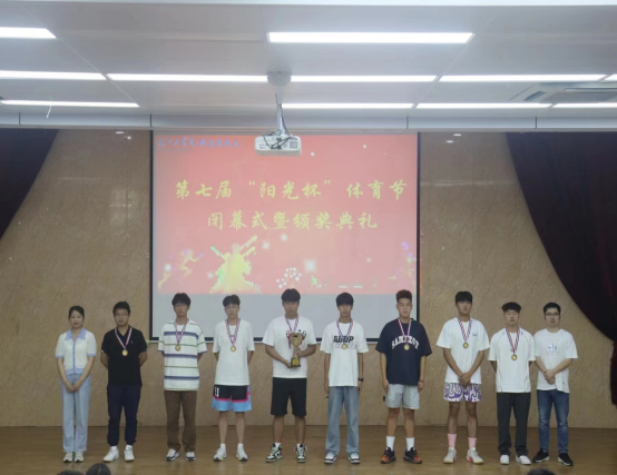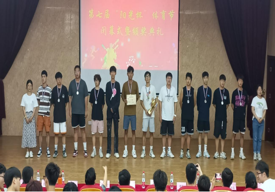 颁奖典礼上,各位老师分别为获奖队伍和个人颁发了奖杯、奖牌及证书,并与大家一起合影留念。活动最后,周其松老师致闭幕词,他对获奖的同学致以热烈的祝贺,对各位老师及支持活动的同学、工作人员致以了最真挚的感谢。同时希望全体同学要高度发扬阳光体育节中的“团结、拼搏、向上、友谊”的良好风貌。要热爱生命,要自爱,从爱惜自己的身体开始,勤于体育锻炼;要心向阳光,要自信,从树立一个健康的心理开始,摆正心态,乐观向上;要坚持不懈,要自强,人生路漫漫其修远兮,要持之以恒,顽强拼搏。